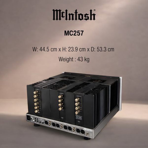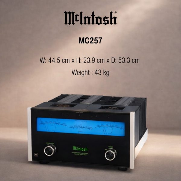 The MC257 sits on a polished stainless steel chassis and bears the classic McIntosh design of a black glass front panel with the TripleView meter, illuminated logo, control knobs, and aluminum end caps